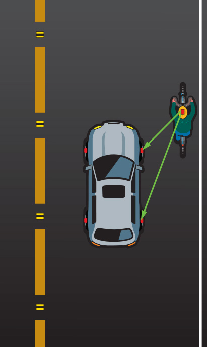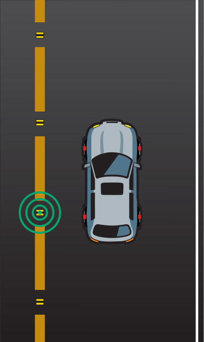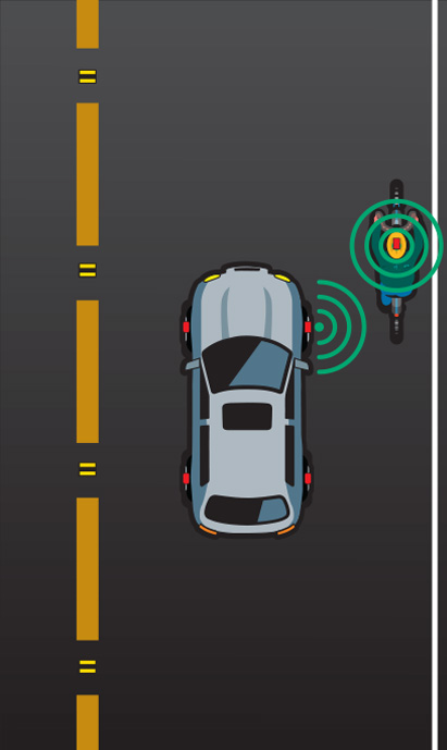 RF interrogation signals can also light up RF-eye beacons embedded in objects utilized by other road users. In future manufacturing runs, stronger RF interrogation signals may be issued from the front or rear of the vehicle to light up beacons in the distance. TPMS sensors in the wheel wells will be able to detect these signals.